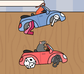 Click on the logo to start the game, and this will open up the junk wheel booster pack. Players, pick one junk wheel (hopefully a good one!) for your own car and then pick a different junk wheel (hopefully a wonky one!) for your opponent. Then sit back and cheer on your drivers as they scramble towards the finish line!